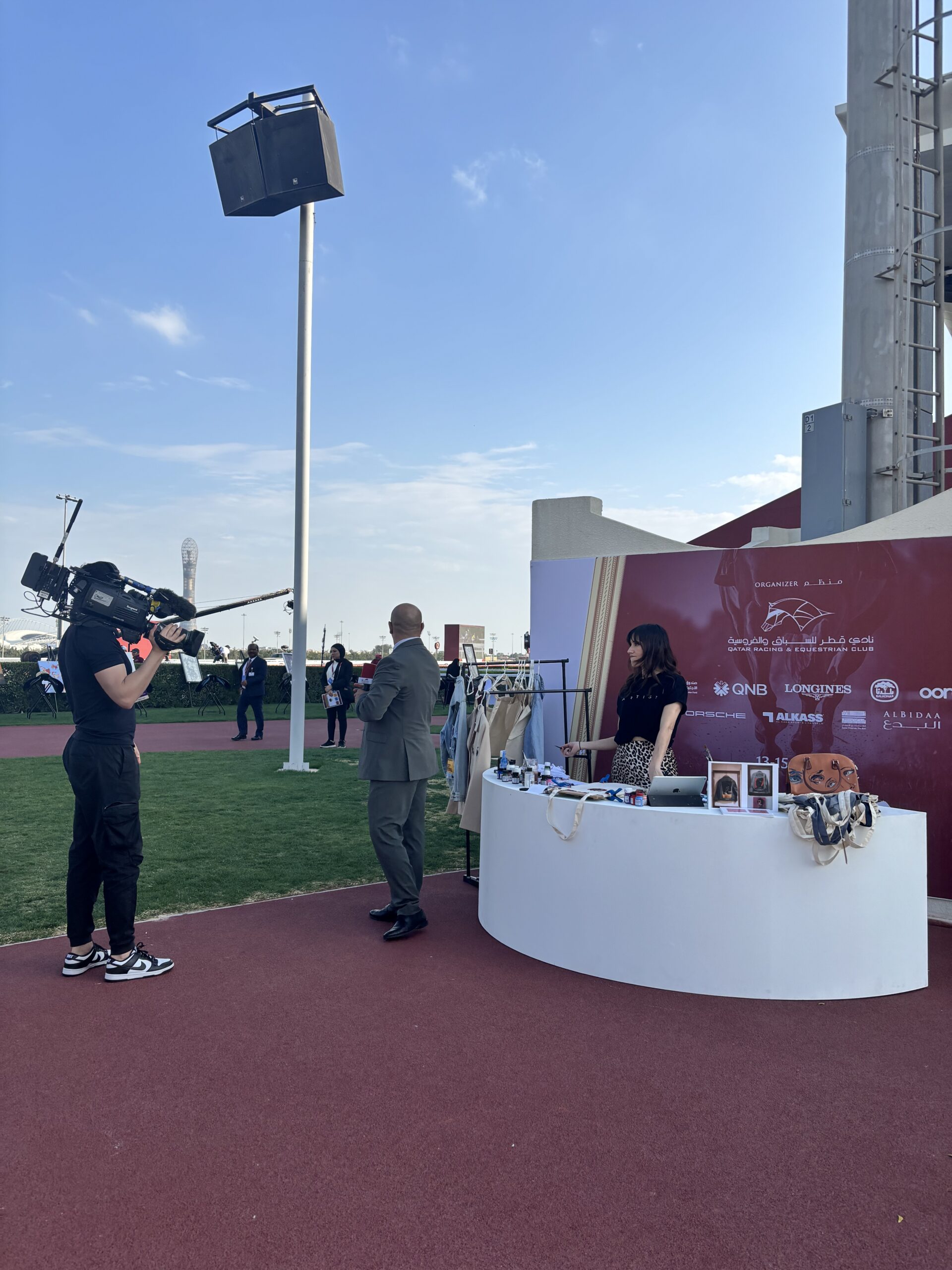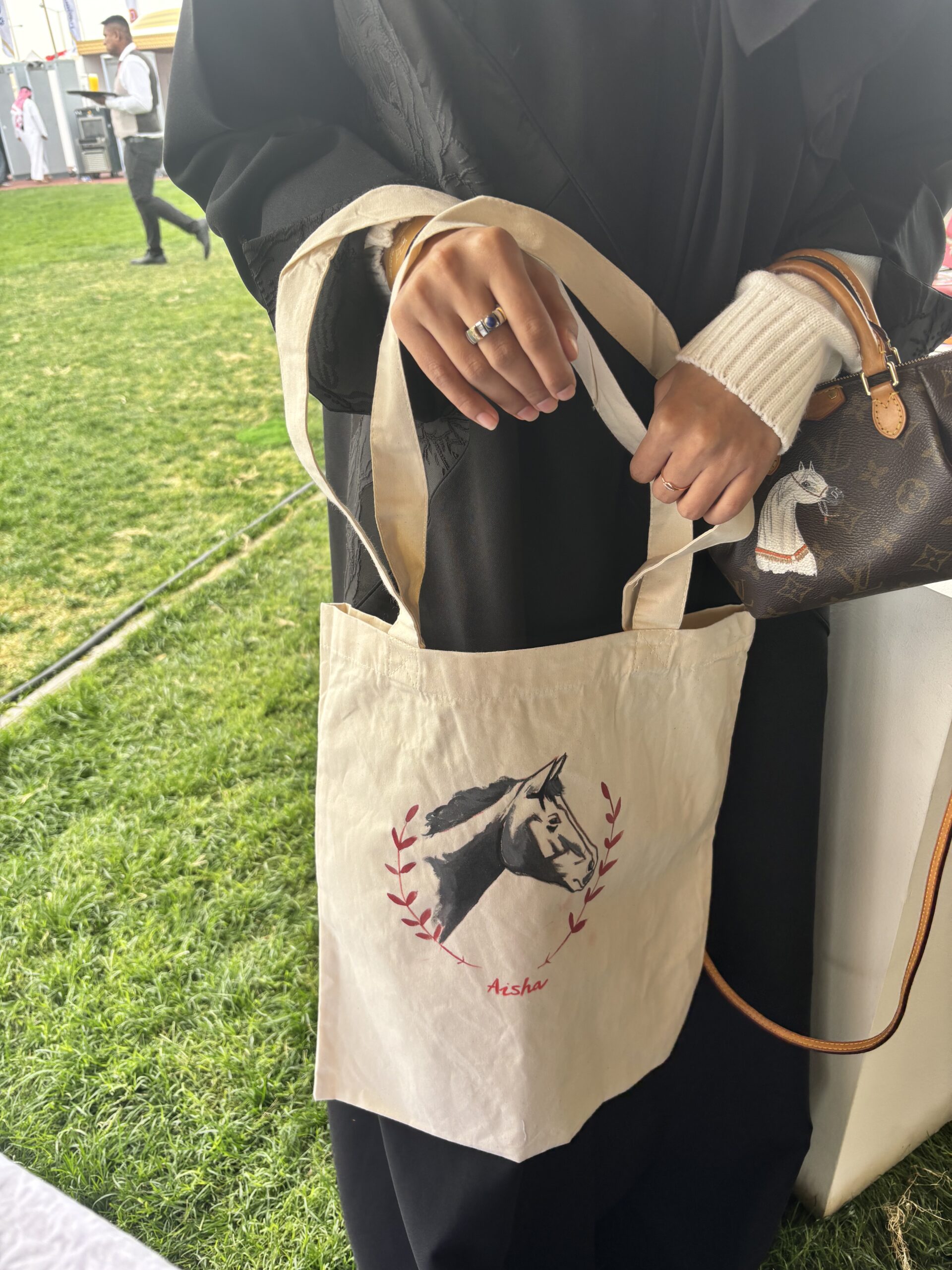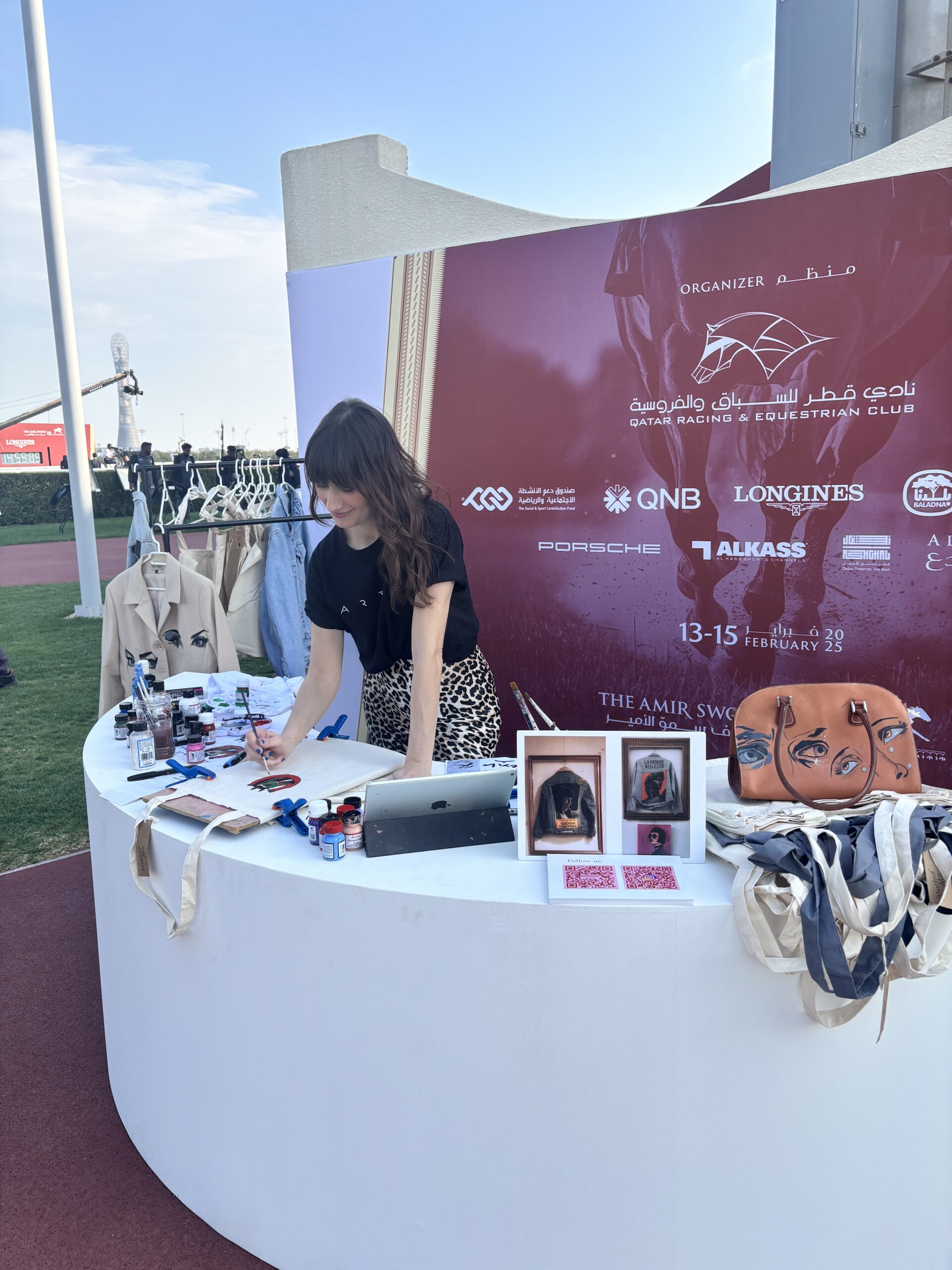 Evento de creación de un tote bag pintadas a mano para obsequiar a los invitados durante el evento de carrera de caballos para el Amir en Doha, Qatar. Con la agencia de eventos de artistas Creartys. Febrero 2025
